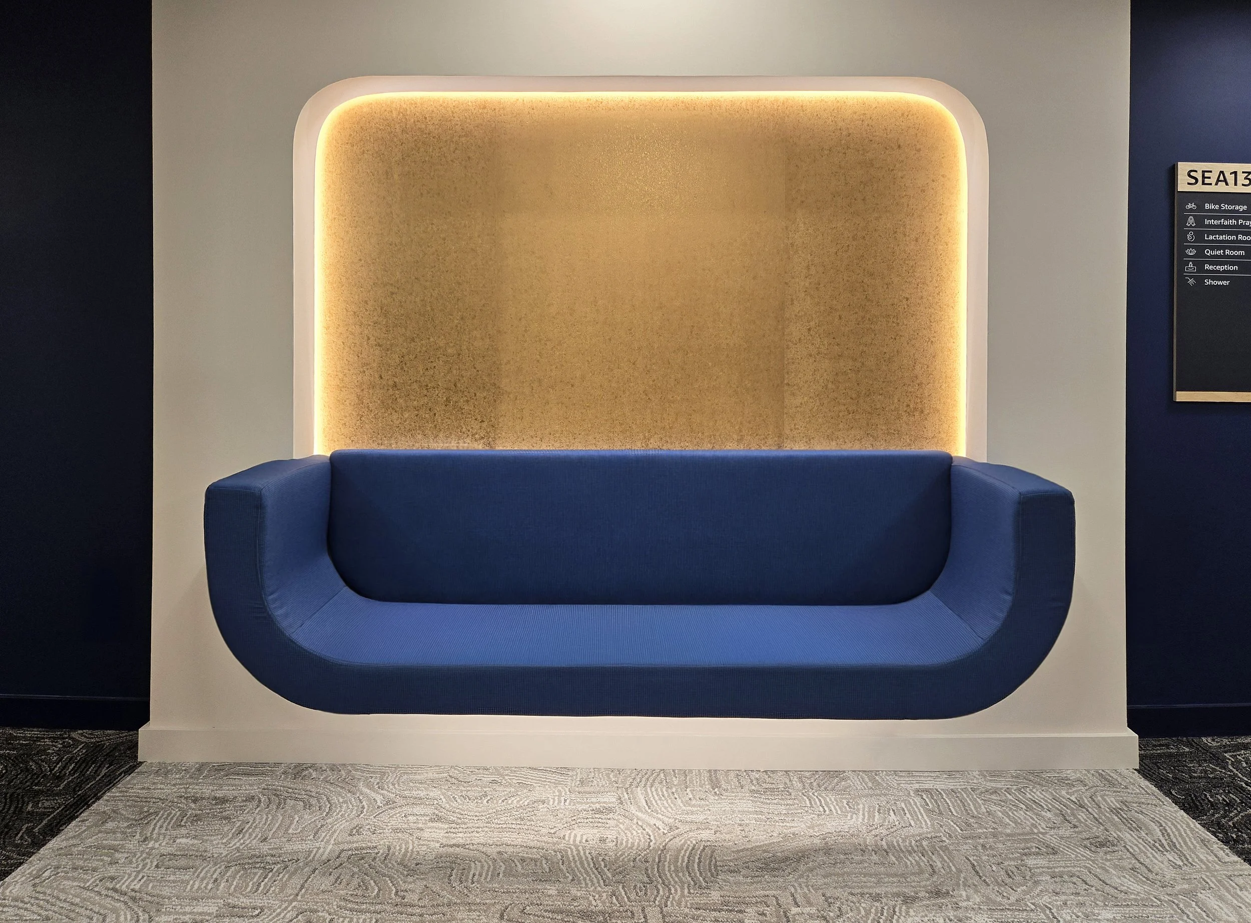 The commercial workplace renovation for a Satellite Technology group for a large Online Retailer, draws inspiration from the Overview Effect, the profound shift in perspective astronauts experience when viewing Earth from space. This concept influenced every aspect of the design, from material selection to spatial elements, evoking Earth's beauty and fragility. The material palette reflects aerial views of the planet, with combed plaster and tile resembling farmland and swirling carpets mimicking mountain ranges. The ceiling design abstracts the aperture grid found in early space photography, reinforcing the connection to documenting Earth from above. The lobby design pays homage to the lunar biome, incorporating retro sci-fi aesthetics, gold accents referencing the Apollo lander, and a reception desk symbolizing satellite orbits. The kitchenette represents the rural biome, featuring natural tones and textures that echo Earth's landscapes as seen from orbit. Through these design elements, the space immerses occupants in a narrative that celebrates exploration, connection, and the responsibility to protect our planet.